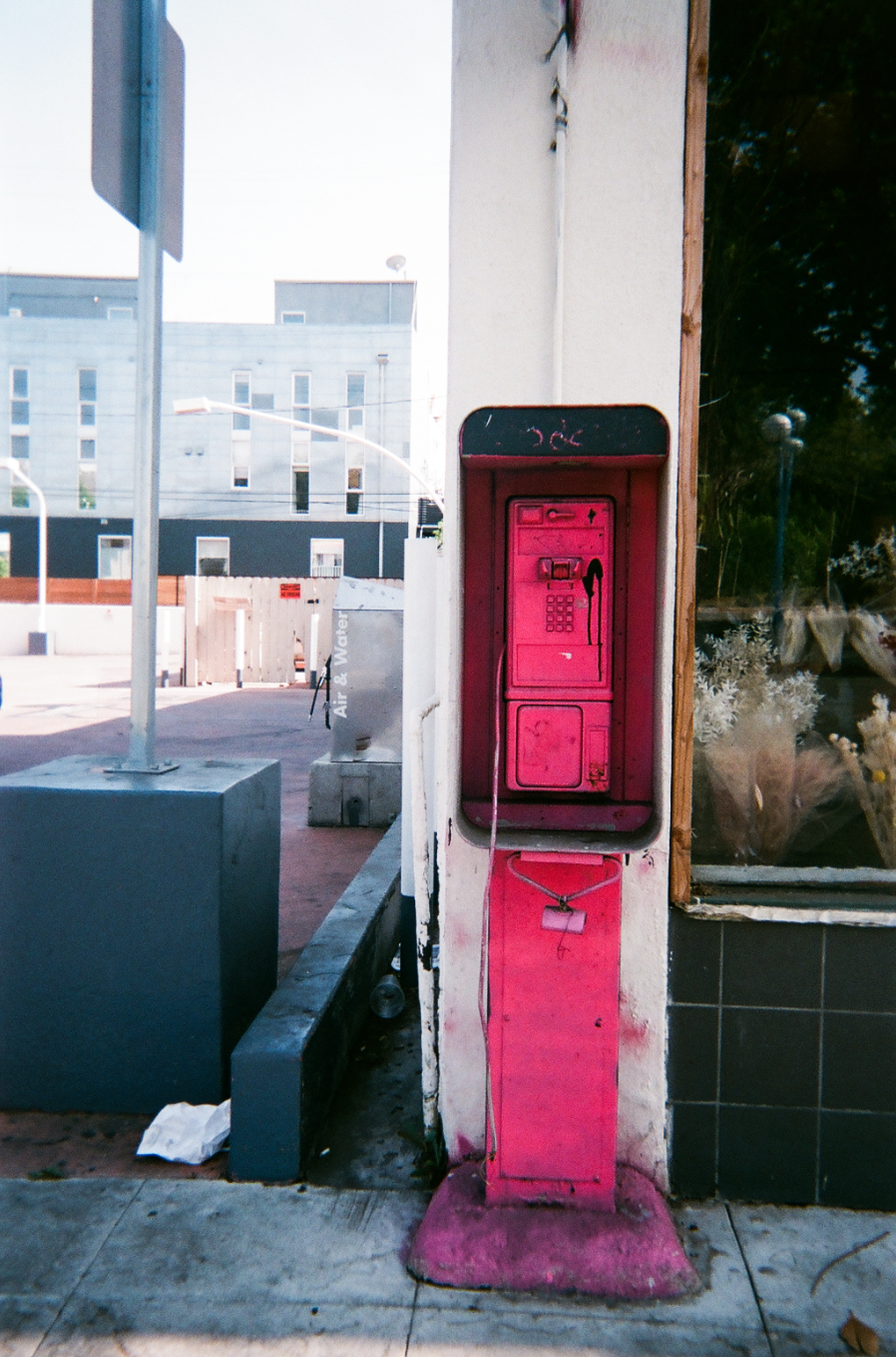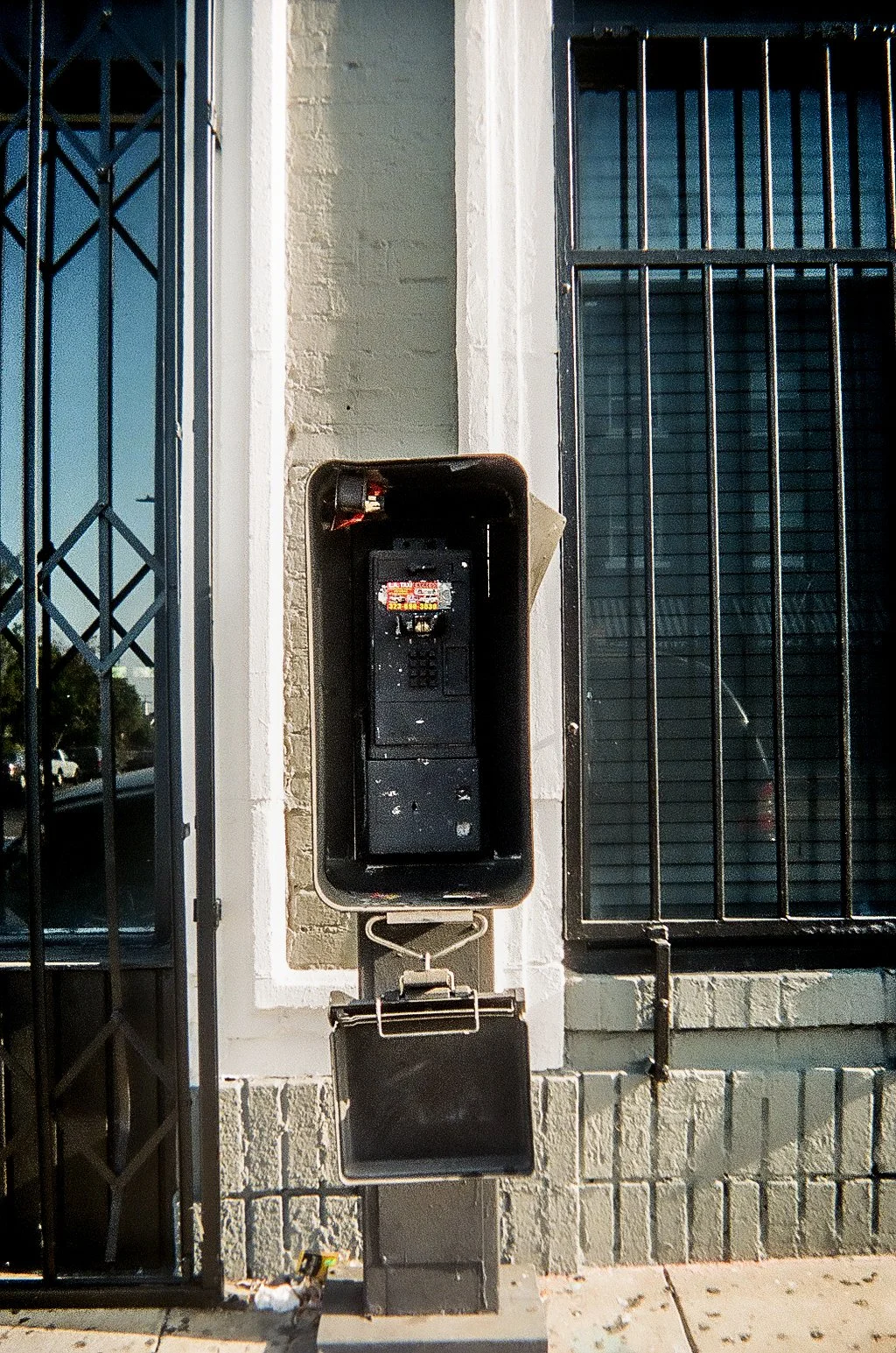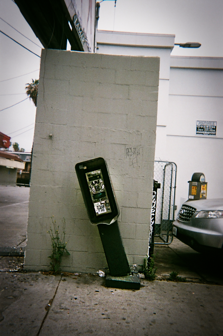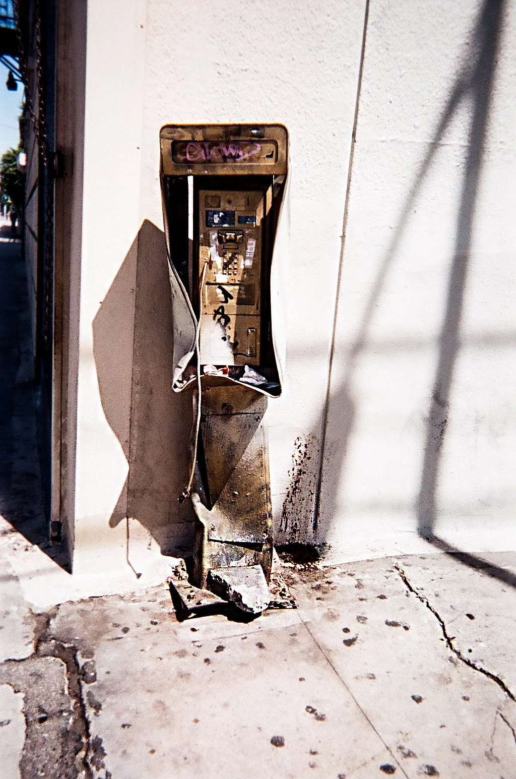 Mobile phones control our primary method of communication. And with the once needed payphone invention, which first appeared in 1898, gradually fading to memory, this series is a glimpse back in time to appreciate the payphone’s brilliance and usefulness in their most recent last looks. Many of these phones are decayed and withering from neglect. The once coin-operated “pre-pay” mode of communication is a genius found in common necessity and will soon be forgotten to time, as miscreants continuously abuse them. Eventually the decaying phones of Los Angeles will disappear entirely, as they are the subject of this on-going study. Each photograph is an environmental portrait. And even though the phones are out of commission, they remain — a presence and absence at the same time.